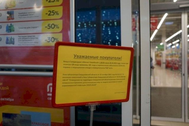 «Вход в гипермаркет «Магнит. Семейный» с 00:00 30.10.2021 года только при наличии QR-кода прививки, QR-кода о перенесенном заболевании COVID-19, справке о медицинском отводе и отрицательном ПЦР тесте», - сообщалось на табличке у магазина.