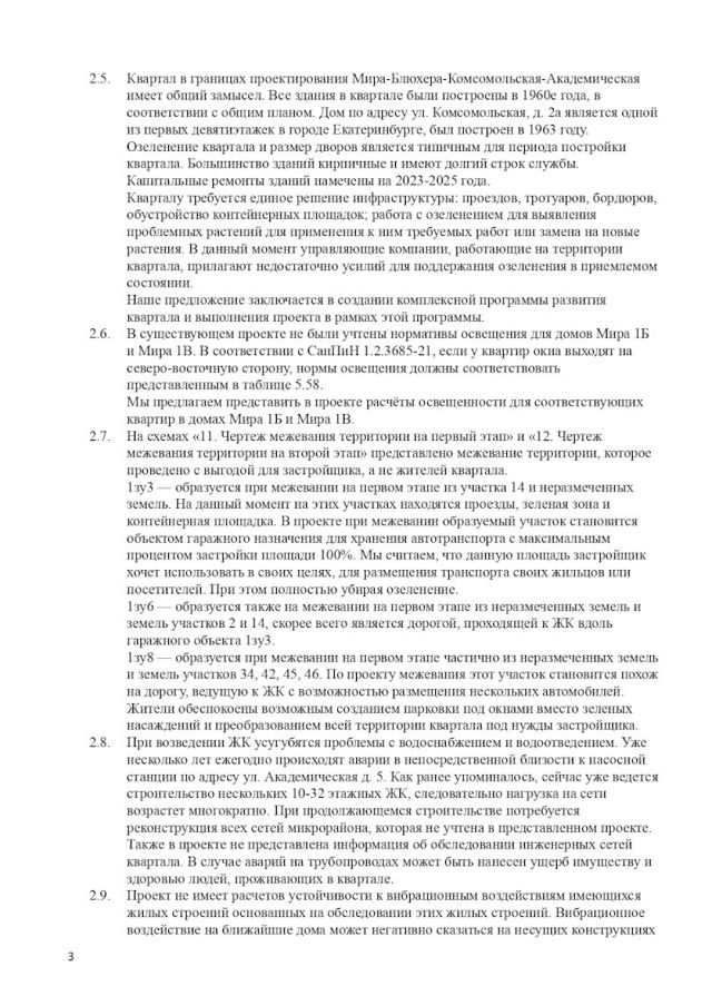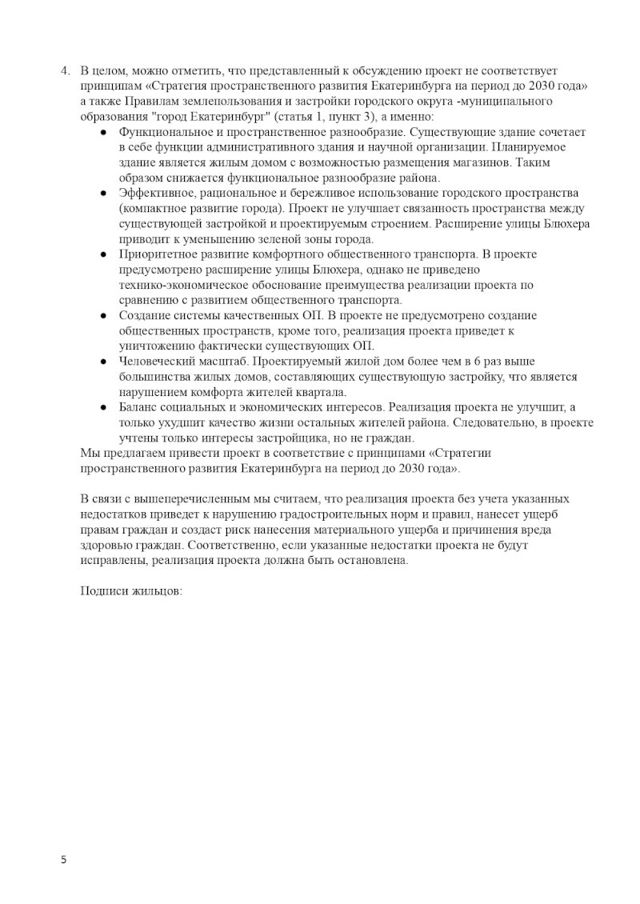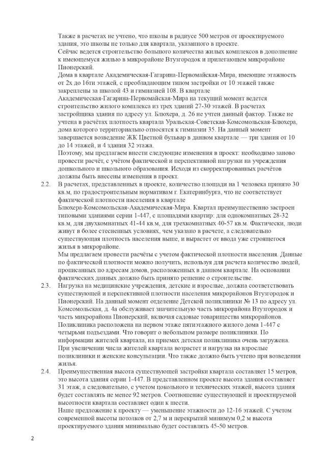 Они уже четвертый день собирают подписи под обращениями в администрацию Екатеринбурга и в гордуму. На данный момент удалось собрать уже почти 100 подписей. Активисты опасаются, что появление небоскреба и расширение дороги ухудшит условия жизни соседям: во дворах станет меньше света, станет больше выхлопных газов, места для парковки или выгула собак практически не останется. Кроме того, в окрестных хрущевках могут снизиться напор воды или температура батарей.