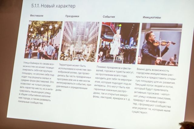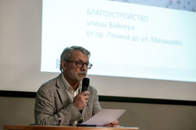 Первыми выступили представители Открытого консорциума. Архитектор Илья Полянских выделил четыре текущие проблем улицы Вайнера - визуальный шум, неблагополучные маргинальные посетители улицы, обильное количество лавочек, отсутсвие общего вектора развития.