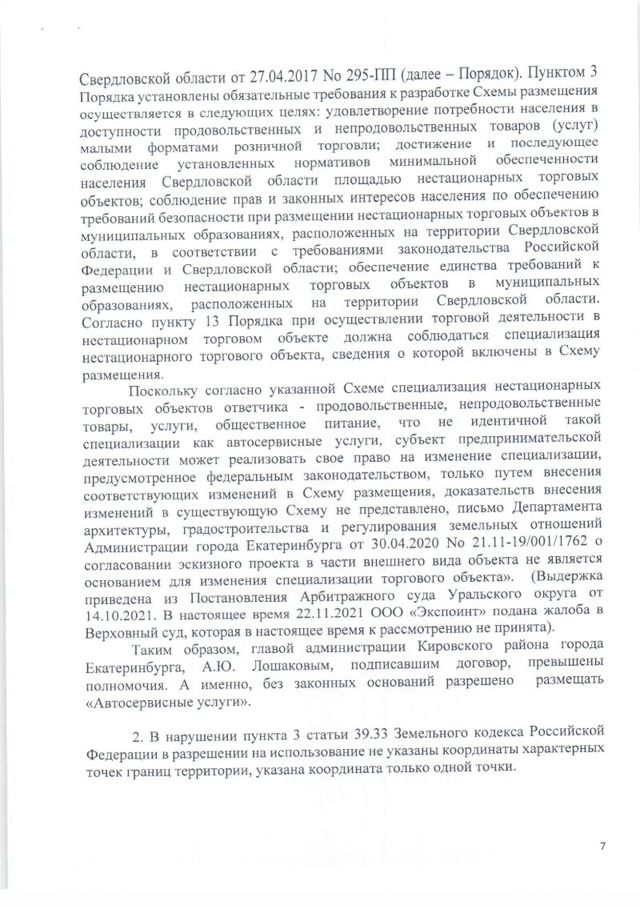 Также, подробно изучив документы, активисты пришли к выводу, что экс-глава Кировского района Александр Лошаков не имел права менять предмет договора: согласно Постановлению значится торговая галерея, а в договоре дополнительно «Автосервисные услуги».