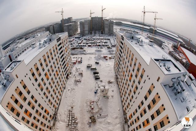 Как уже сообщалось неоднократно, деревня Универсиады — это не только места для размещения участников Игр (а в будущем студентов УрФУ). Это обширный комплекс площадью 30 га, в состав которого входят Дворец водных видов спорта, медицинский центр, а также общественный центр.