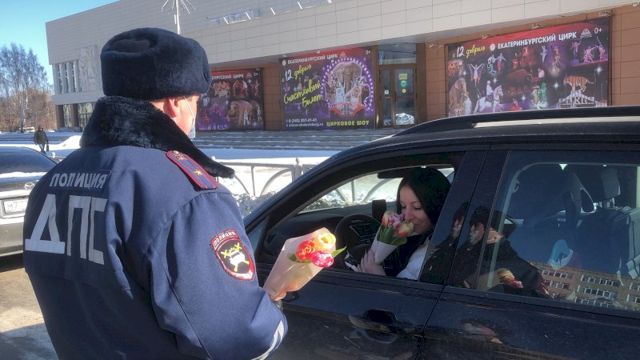 В Екатеринбурге сотрудники ГИБДД поздравили женщин-автомобилисток с Международным женским днем. В екатеринбургском ГИБДД это уже многолетняя традиция, когда 8 марта инспекторы не только следят за порядком на дороге, но и поздравляют женщин.