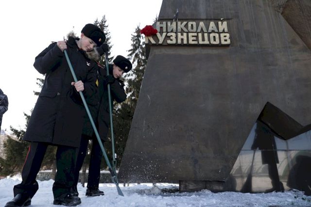 Сегодня молодые люди, будущие российские офицеры, расчистили снег вокруг памятника Кузнецову. Затем к нему были возложены цветы и венок.