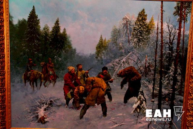 Представлены на выставке и произведения, посвященные медвежьей охоте. Император Александр II любил приглашать на такие мероприятия дипломатов из других стран, чтобы показать им мощь русской природы и русского человека, который готов вступить в схватку со свирепым хищником. А завершает экспозицию картина Виктора Шилова, посвященная допетровской Руси, где изображен боярский пир. На столе у пирующих – добытая на охоте дичь и другие яства.