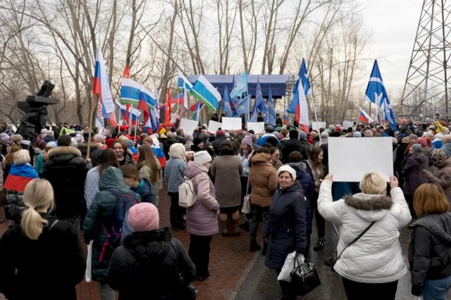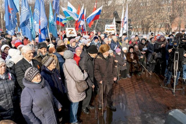 Участие в митинге приняли 3 тыс. человек: ветераны Великой Отечественной войны, труженики тыла, депутаты гордумы, волонтеры и студенты. Мероприятие представляло собой концерт с патриотическими песнями, со сцены была предоставлена возможность выступить со словами поддержки в адрес армии для всех желающих.