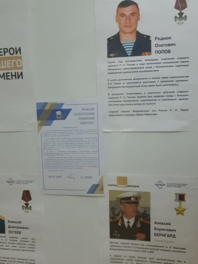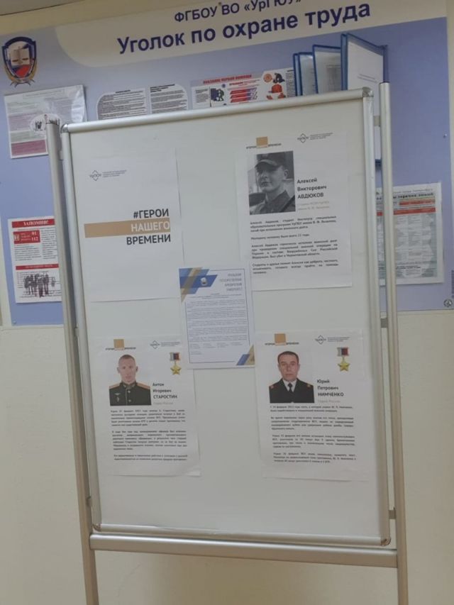 Информация об Алексее Авдюкове размещена в холле университета, где организована выставка, посвященная военнослужащим, отличившимся во время спецоперации. На стенде рассказывается о подвигах, совершенных военными, некоторые из них получили звание Героя России.