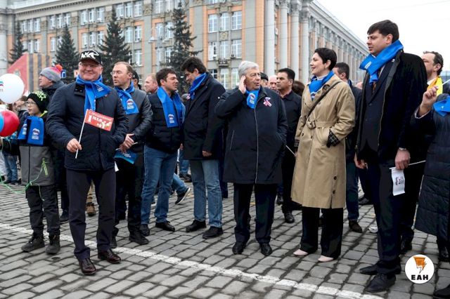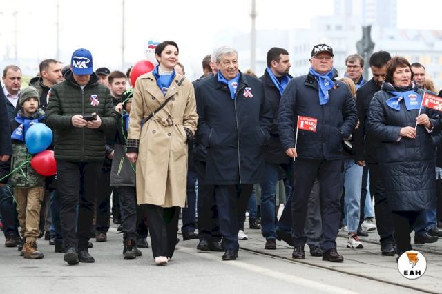 Когда все приготовления к началу демонстрации были окончены, во главе колонны выстроились руководители области и города: губернатор Евгений Куйвашев и мэр Екатеринбурга Алексей Орлов. В один ряд с ними встали председатель свердловского Заксобрания Людмила Бабушкина, первый вице-спикер областного парламента, бывший мэр Екатеринбурга Аркадий Чернецкий. Впервые за долгое время на публике появился еще один бывший руководитель уральской столицы, а ныне сенатор Александр Высокинский.