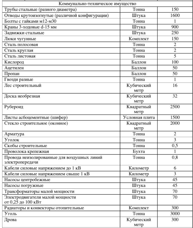Размер запаса определяет приложение к постановлению. Согласно ему, в продовольственный запас вошли мука (1840 кг), хлеб, картофель, крупа, морковь, капуста, лук, детское фруктовое пюре, сахар, печенье и другие продукты. В товары первой необходимости вошли чайник, посуда, ведро, мыло и моющее средства. Также в списке можно найти бензин, электрооборудование и мебель для пунктов временного размещения.