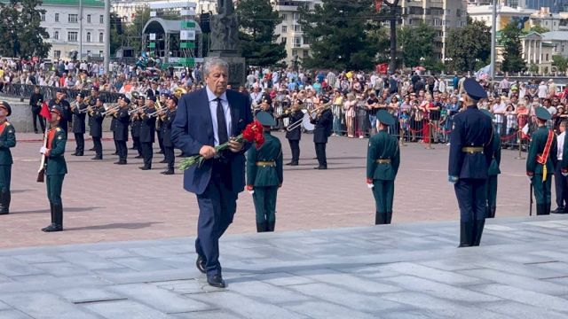 Традиционно церемония началась в 12:00 с небольшого военного парада после чего к памятнику для возложения цветов проследовали уральский полпред Владимир Якушев, губернатор Свердловской области Евгений Куйвашев, глава Екатеринбурга Алексей Орлов, спикер свердловского заксобрания Людмила Бабушкина, митрополит Верхотурский и Екатеринбургский Евгений, сенатор и бывший мэр Алесандр Высокинский, бывший мэр Екатеринбурга и вице-спикер свердловского заксобрания Аркадий Чернецкий.