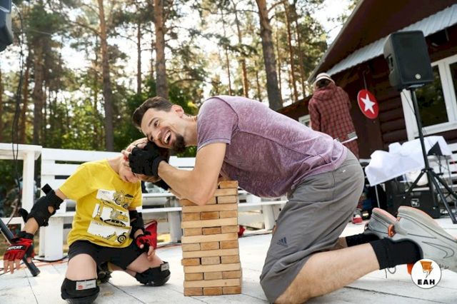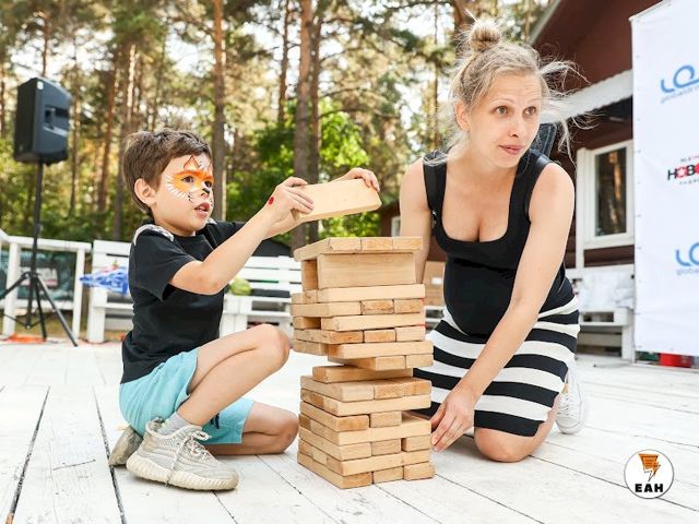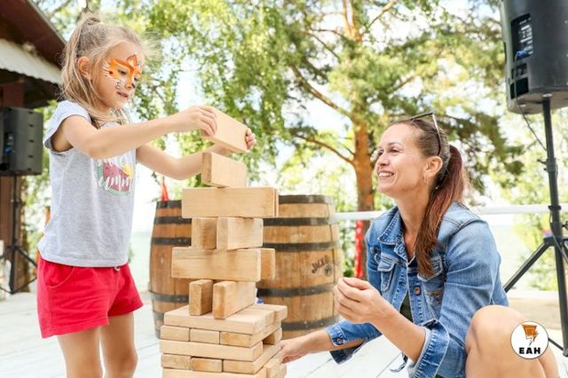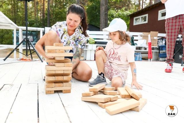 С самого утра на берегу озера расположилось несколько зон с разными активностями. Пришедшие на фестиваль семьи с детьми сразу облюбовали гигантские шашки, дженгу, огромный кубик-рубика.