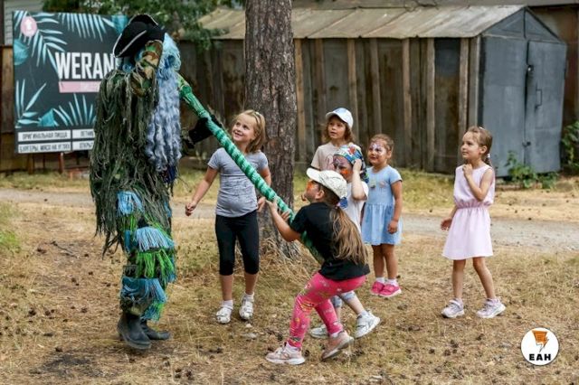 С яркими рисунками на лицах дети бежали играть в компании Водяного и Кикиморы от «Парка сказов». Аниматоры развлекали гостей активными играми и веселыми шутками.