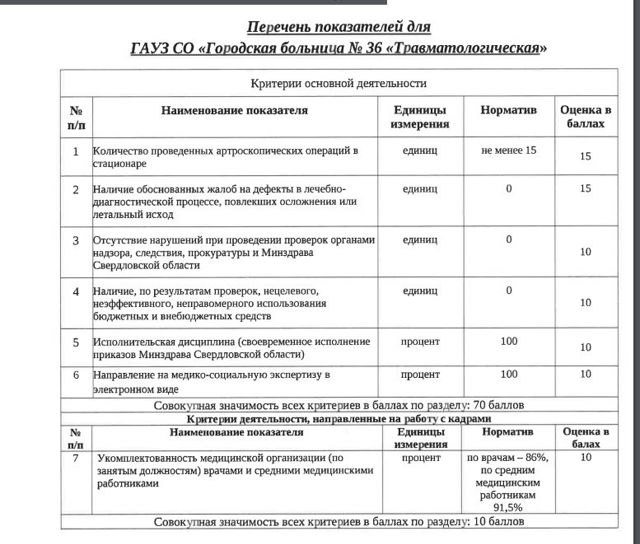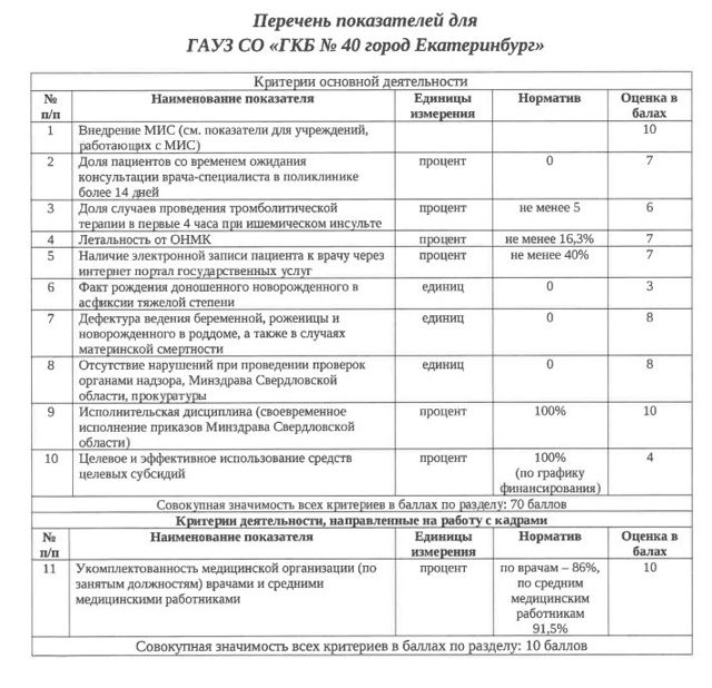 Отдельно будут учитываться и обоснованные жалобы на организацию и качество оказания медпомощи, приведших к тяжелым нарушениям здоровья, инвалидности или смерти. Кроме того, премию главврачу и вовсе могут срезать на 50%, если тот получил дисциплинарное взыскание или зафиксировано нецелевое использование бюджетных средств на сумму 100 тысяч рублей. Премию могут полностью отменить, если у больницы обнаружится просроченная кредиторская задолженность за счет средств ОМС или областного бюджета, или за низку оценку работы медучреждению. Отметим, что в документе отдельно прописаны все критерии и баллы для каждого медучреждения.