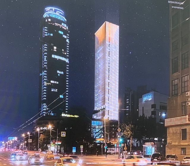 По мнению архитекторов компании, новый небоскреб должен стать парой существующему «Высоцкому». Они предлагают сделать нижнюю часть здания темным, а верхнюю подсветить, чтобы она напоминала космический корабль в небе.