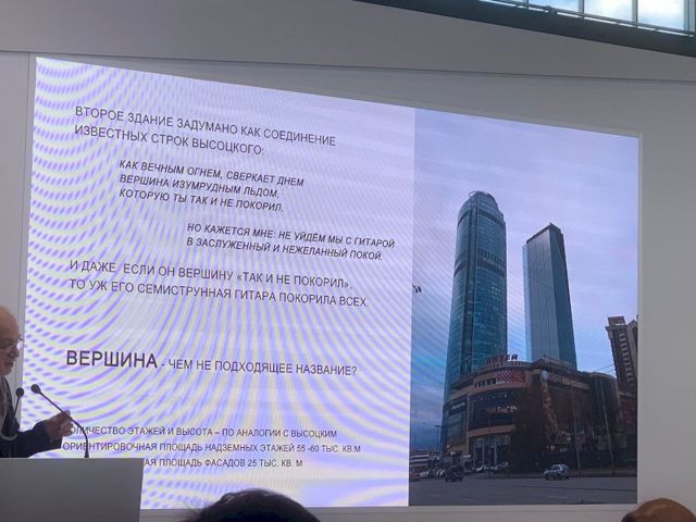 Авторы этой концепции тоже решили усилить образ Владимира Высоцкого и создать не конкуренцию, а дополнение. Именно поэтому здание, по их мнению, должно напоминать семиструнную гитару. Оно задумано как соединение известных строк Высоцкого: «Как вечным огнем, сверкает днем вершина изумрудным льдом, которую ты так и не покорил». Авторы предлагают назвать новый небоскреб «Вершина».