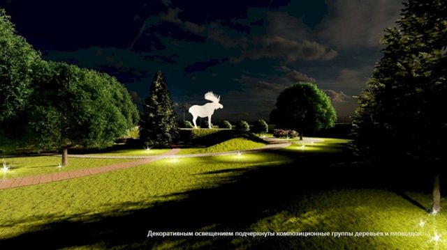 Доминантами пространства станут фигуры лося и медведя из алюминия со светодиодной подсветкой. Их размер в высоту будет составлять более 13 метров, а в длину более 20 метров.