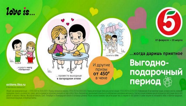 Акция продлится до 20 марта. Чтобы стать ее участником, достаточно совершить покупку в любом магазине «Пятёрочка» на сумму от 450 рублей. После этого покупатели получат гарантированный романтический приз - электронную открытку в стиле популярной серии Love is, отрисованную эксклюзивно для торговой сети. Открытками, символизирующими настоящие и светлые чувства, можно будет делиться с друзьями через мессенджеры. За время акции гости магазинов могут собрать всю коллекцию из 10 открыток и одновременно принять участие в розыгрыше Smart-телевизора.
