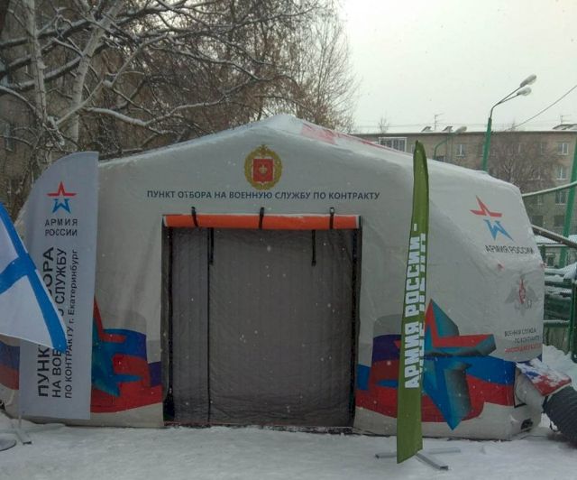 В Екатеринбурге в День защитника Отечества установили мобильные пункты отбора на военную службу по контракту. В частности, такая палатка сегодня работает на ул. Мичурина, 206, недалеко от ЦПКиО имени Маяковского, сообщает читатель ЕАН.