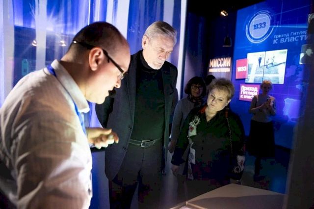 Александр Михайлов намеревался приехать еще на открытие выставки о Николае Кузнецове, но увидел исторический проект Фонда святой Екатерины только сейчас, спустя два года. Сопровождала его министр культуры Свердловской области Светлана Учайкина.