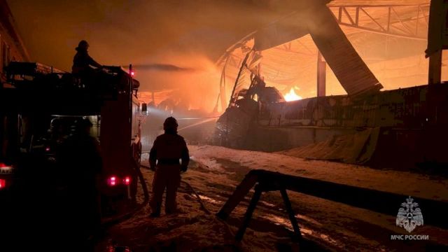 В Тавде полыхает металлический ангар. Огонь распространился на площади 1600 кв.м.