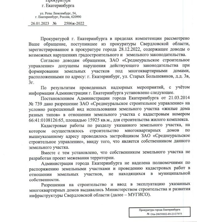 Аналогичная история повторилась после сдачи секции по ул. Старых Большевиков, 3г. АО «Среднеуральское строительное управление» также без оповещения собственников пригласило для межевания территорий кадастрового инженера. После его визита от придомовой территории отрезали 3 тыс. кв. м. После таких откровений собственники потребовали встречи с представителями АО «Среднеуральское строительное управление».
