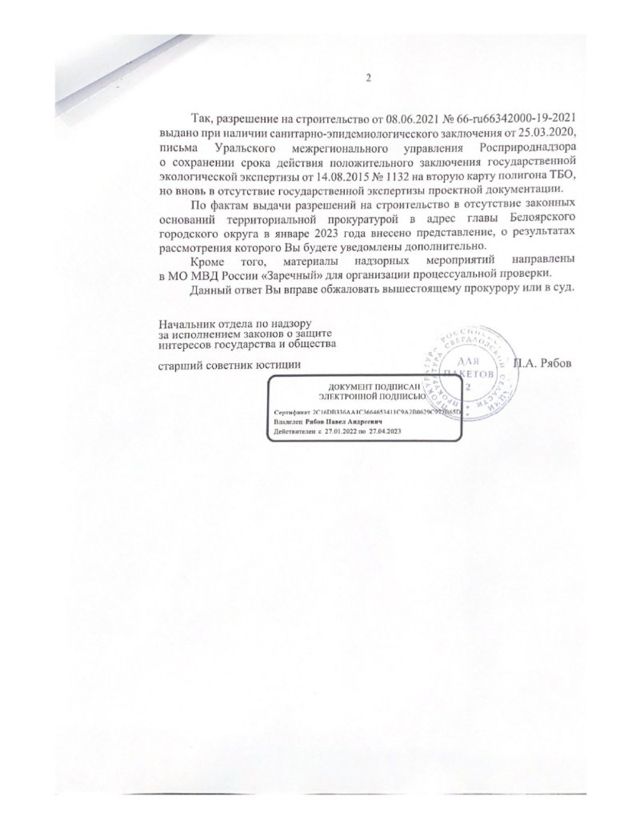 Белоярская районная прокуратура установила, что разрешение ООО «УМПО» на строительство полигона выдала администрация муниципалитета. Но компания почему-то не предоставила чиновникам государственную экспертизу проектной документации, хотя она является обязательной. Аналогичное нарушение местные власти допустили при выдаче разрешения на строительство второй карты полигона ТБО.