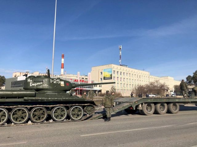 По словам корреспондента ЕАН, еще до начала репетиции сломался танк Т-34. Его эвакуируют на специальной платформе.