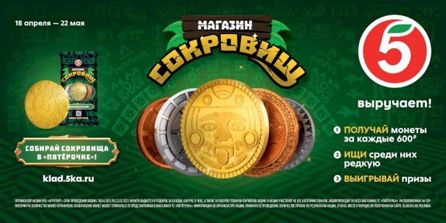 Юные гости «Пятёрочки» смогут посетить «Магазин сокровищ», собрать коллекцию уникальных монет и выиграть ценные призы. Соответствующая акция будет проходить во всех магазинах торговой сети, в том числе в Свердловской области, с 18 апреля по 22 мая.