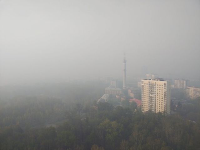 Екатеринбург в ночь с 8 на 9 мая плотно накрыл дым от лесных пожаров. Из окон верхних этажей жилых домов центр города не просматривается.
