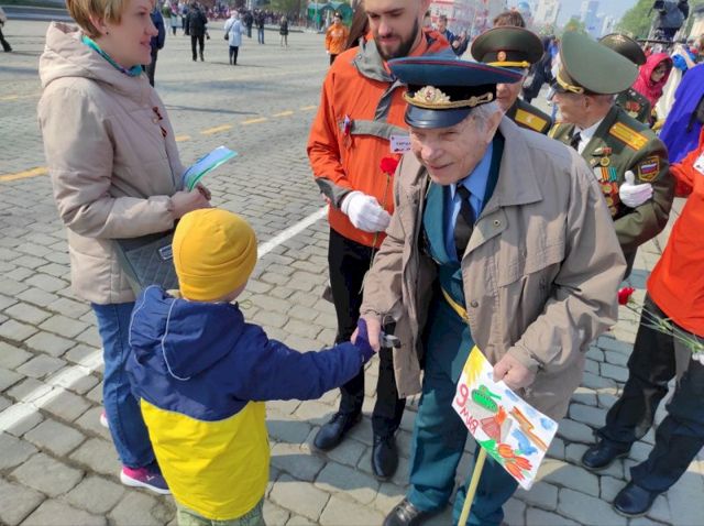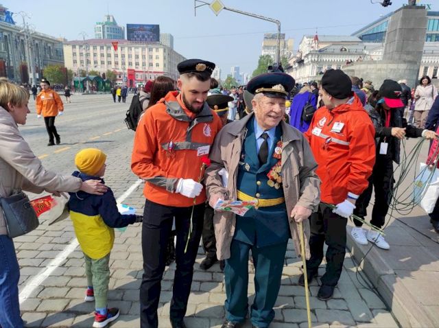 Традиционно перед парадом на площади 1905 года чествовали ветеранов Великой Отечественной войны, которых на УАЗе доставили к почетным местам у трибуны. Далее последовал торжественный вынос копии Знамени Победы, которая находится у участника Великой Отечественной войны полковника Владимира Степановича Лупейко. И сегодня ему исполнился 101 год