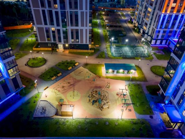 Предусмотрены лаунж-зоны для отдыха с качелями и беседками, бесплатный Wi-Fi. Здесь возведена отдельная воркаут-зона - комплекс уличных тренажеров, площадки для игры в теннис, баскетбола и футбола. А в новой очереди строительства появится первая круглая площадка для панна – разновидности уличного футбола.