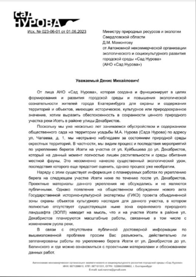 ЕАН обратился за разъяснениями в мэрию с вопросом о планах застройщика по возможному изменению русла реки или ее засыпке. Ответ пришел следующий: «На участке реки Исети в границах улиц Белинского - Декабристов предусмотрено проведение мероприятий по берегоукреплению. Развитие и благоустройство данной территории планируется в соответствии с концепцией, которая опубликована на официальном портале Екатеринбурга». Такой же ответ пришел организаторам «Сада Нурова».