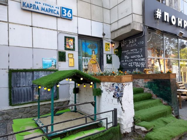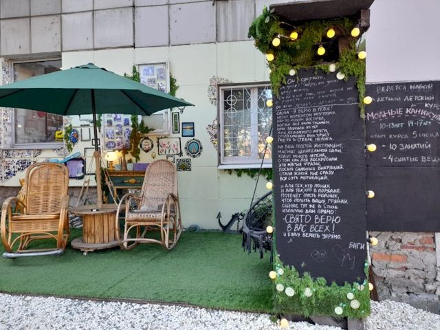 Год назад на улице Карла Маркса сложилась необычная коллаборация - кофейня «Понраву» и мастерская «Лоскутный домик». Творческие люди объединились, чтобы украсить арендуемое помещение не только внутри, но и снаружи. Вложили немалые деньги в обустройство придомовой территории: убрали окурки, мусор, постелили искусственный газон, поставили кресла-качалки и качели, испорченные стены с нецензурными граффити превратили в арт-пространство для уличных художников.