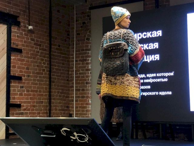 На конференции предприниматели предложили свои варанты использования идола. Модельер и дизайнер Мария Варламова представила коллекцию одежды с использованием шигирской символики, разработанную нейросетью.