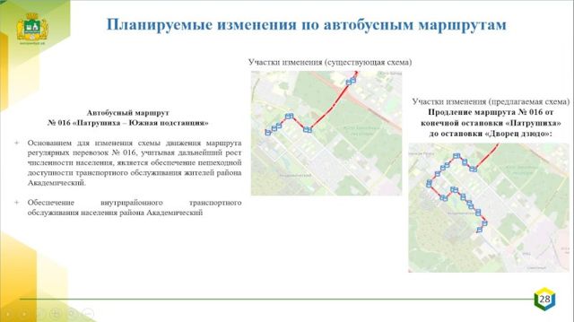 Маршрут № 016 «Патрушиха – Южная подстанция» будет продлен до Дворца дзюдо;