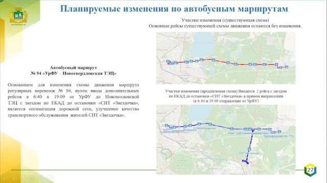 На маршрут № 94 «УрФУ – Новосвердловская ТЭЦ» добавят дополнительные утренние и вечерние рейсы с заездом в СНТ «Звездочка»;
