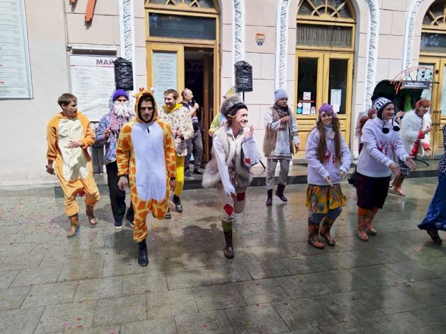 У «Коляда-театра» на проспекте Ленина начали прямо под дождем устанавливать небольшие декорации и пушку для выпуска пены. Когда капать перестало, у входа в театр включили музыку и трое актеров вышли на разогрев публики (которая отсутствовала). За десять минут до старта основной программы внезапно показалось солнце, небо на время очистилось от туч. Затем из-за дверей показался сам мэтр, заявивший без скромности, что лично попросил солнце выйти из-за облаков. Далее на улицу высыпали остальные актеры.
