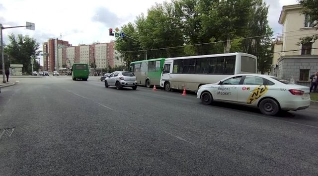 ДТП произошло на улице Технической, возле дома № 70. По предварительным данным, водитель автобуса «ПАЗ» (маршрут 083) перестраивался и не уступил дорогу автобусу «ПАЗ» 014 маршрута, ехавшего в попутном направлении. После чего произошло столкновение еще с двумя легковыми автомобилями.