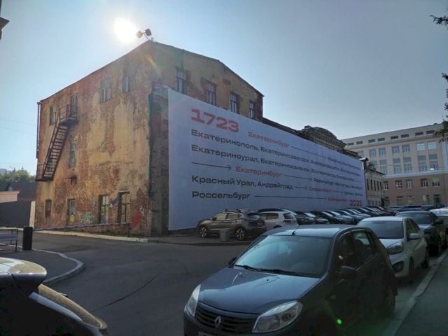 В центре Екатеринбурга на перекрестке Первомайской и Горького появилась крупная растяжка, прикрывающая собой заброшенное здание бывшей золотосплавочной лаборатории.