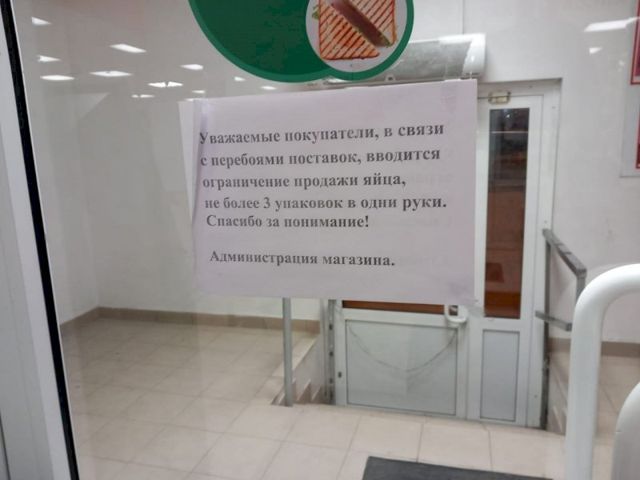 Аналогичные ограничения ввели в сети «Бристоль». Как следует из объявления в магазинах, ограничения введены в связи с «перебоями» с поставками яиц. Ограничения ввели и в фирменных магазинах одного из главных производителей яиц в регионе — птицефабрике «Свердловская». Там продают не более 100 штук в одни руки.