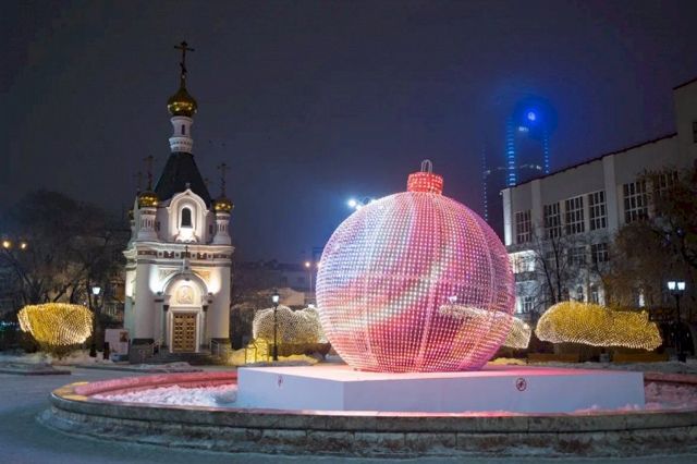 Арт-объекты появились также у храма Большой Златоуст и храма Иннокентия Московского. Еще один новогодний шар был установлен в парке Энгельса, который был реконструирован благодаря Фонду святой Екатерины. Отметим, что Фонд святой Екатерины уже несколько лет украшает столицу Урала к Новому году и Рождеству.