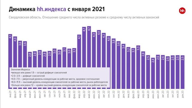 HR-индекс Свердловской области сейчас составляет 2,7. Это говорит о серьезном дефиците кадров. Норма для рынка 5,6 человек на вакансию, отмечает директор hh.ru Урал Оксана Сидлецкая. Безработица сохраняется на историческом минимуме и составляет 0,6%. Но, по словам экспертов, свердловчане не торопятся искать работу и с осторожностью относятся к смене работы.