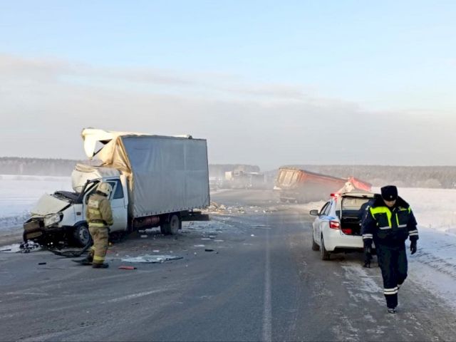 На трассе в Свердловской области сегодня столкнулись сразу девять автомобилей, пять из которых – грузовики. В результате пострадали два человека.