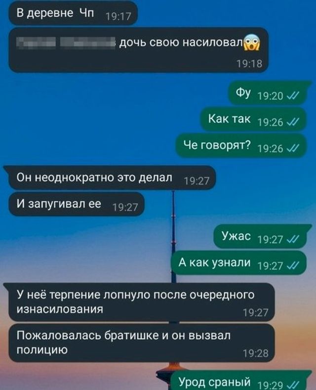 «У нас в деревне Пирогова все только и говорят про это: отец надругался над своей дочерью. СМИ все молчат, видимо, прикрывают все, если будете выставлять, закройте лицо, кто его знает - поймет. Капец, как это все страшно», - сказано в сообщении.