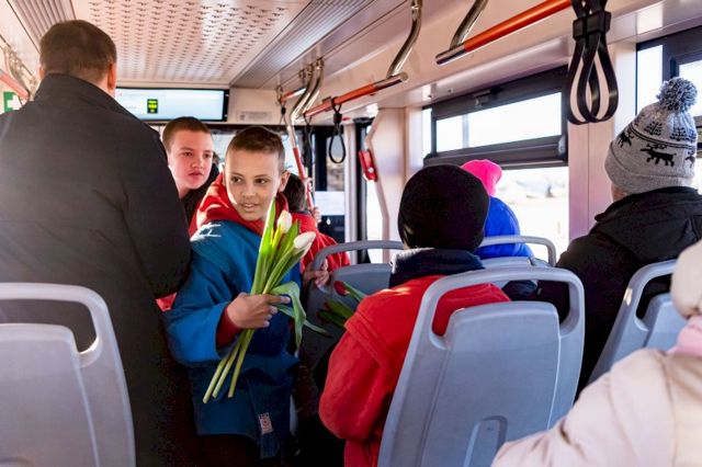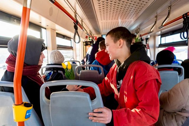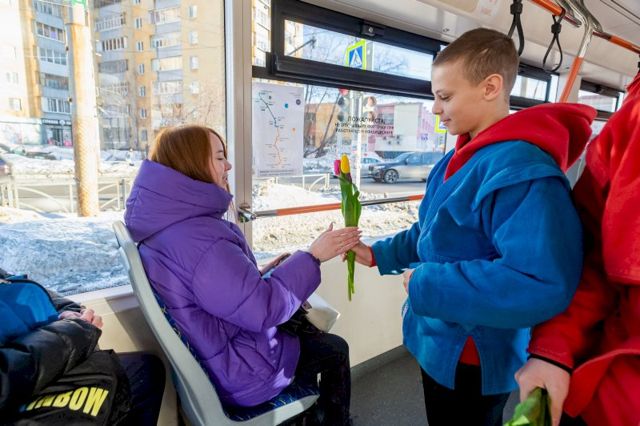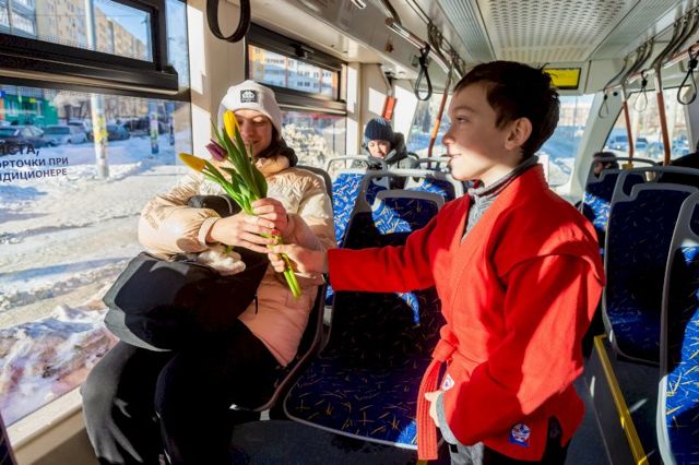 Необычная праздничная акция прошла сегодня в трамваях, курсирующих из Верхней Пышмы в Екатеринбург. Воспитанники Спортивной школы единоборств вместе с тренером Иваном Пантюхиным и координатором федерального партийного проекта «Zа самбо» в Свердловской области Алексеем Сваловым вручили каждой девушке по букету тюльпанов.