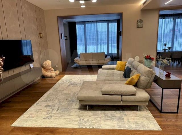 Квартира оборудована системами "умный дои" и "климат контроль". Внутри - дизайнерский ремонт, отдельная гардеробная и кухня 55 квадратных метров. Продавец утверждает, что комнаты обставлены итальянской мебелью, а полы укрыты коврами из Бельгии. К квартире присоединена лоджия площадью 40 "квадратов".
