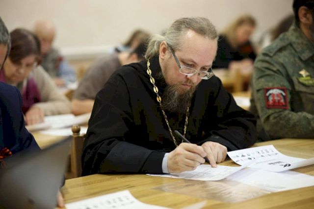 В тесте принимают участие священнослужители, казаки, военные, члены Екатеринбургских отделений ВРНС и ИППО, представители Братства православных следопытов, прихожане храмов Екатеринбурга всех возрастов. Акция началась с молебна, который провели клирики Храма на Крови. После инструктажа и торжественной церемонии открытия участники сели выполнять задание. Сам диктант продлится 45 минут.