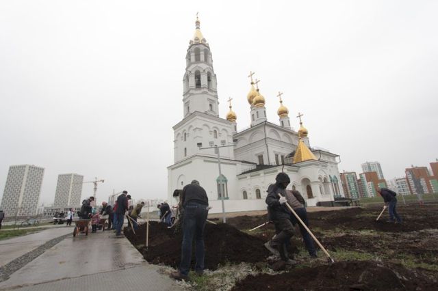 Сегодня жители взрыхлили землю у храма и высадили там траву, обновили сухие деревья и полили все зеленые насаждения. Всех участников акции по завершении работы ждали чай и пирожки.