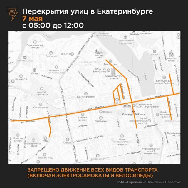 В Екатеринбурге до 9 Мая еще несколько раз будут перекрывать городские улицы в связи с проведением репетиции парада. Так, с 4 мая с 20:00 и до 04:00 будет закрыто движение по перекрестку Ленина, улице 8 Марта, Малышева, Толмачева, Татищева, Первомайской. На 7 мая запланирована дневная репетиция парада. Перечисленные выше улицы будут перекрыты с 05:00 до 12:00. В преддверии Дня Победы в Екатеринбурге закроют движение транспорта в связи с церемонией возложения венков к памятнику Г.К. Жукову. Автомобилистам предлагают следующие пути объезда: