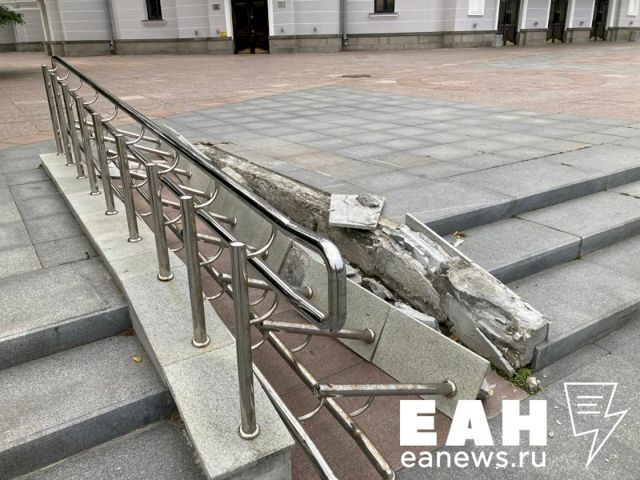 Жители Екатеринбурга обнаружили сломанные перила пандуса в сквере у Оперного театра. В пресс-службе администрации города ЕАН уточнили, что сломанные перила уже убраны. Сейчас решается вопрос о ремонте конструкции.