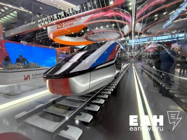 Сразу на входе перед выставочным центром гостей встречают настоящее и будущее общественного транспорта. На постаменте расположен макет скоростного поезда для высокоскоростных магистралей, которые планируется протянуть из столицы, в том числе до Екатеринбурга. Сам макет, предположительно, из гипсокартона. Рядом с этим амбициозный проектом соседствует трамвай «Львенок», который курсирует по первой в стране межмуниципальной линии из Екатеринбурга в Верхнюю Пышму.